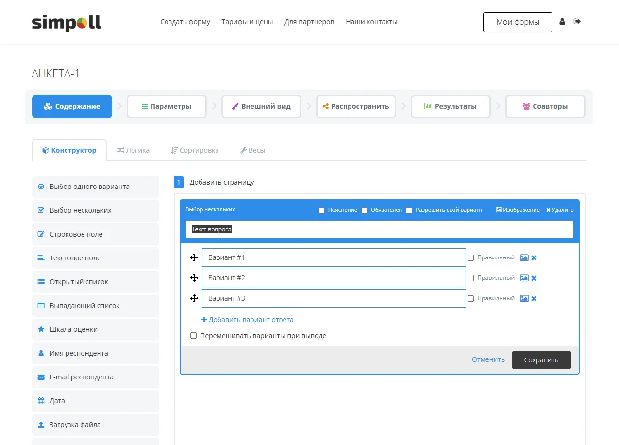 Возможности. Simpoll — сервис с тремя конструкторами интернет-опросов: