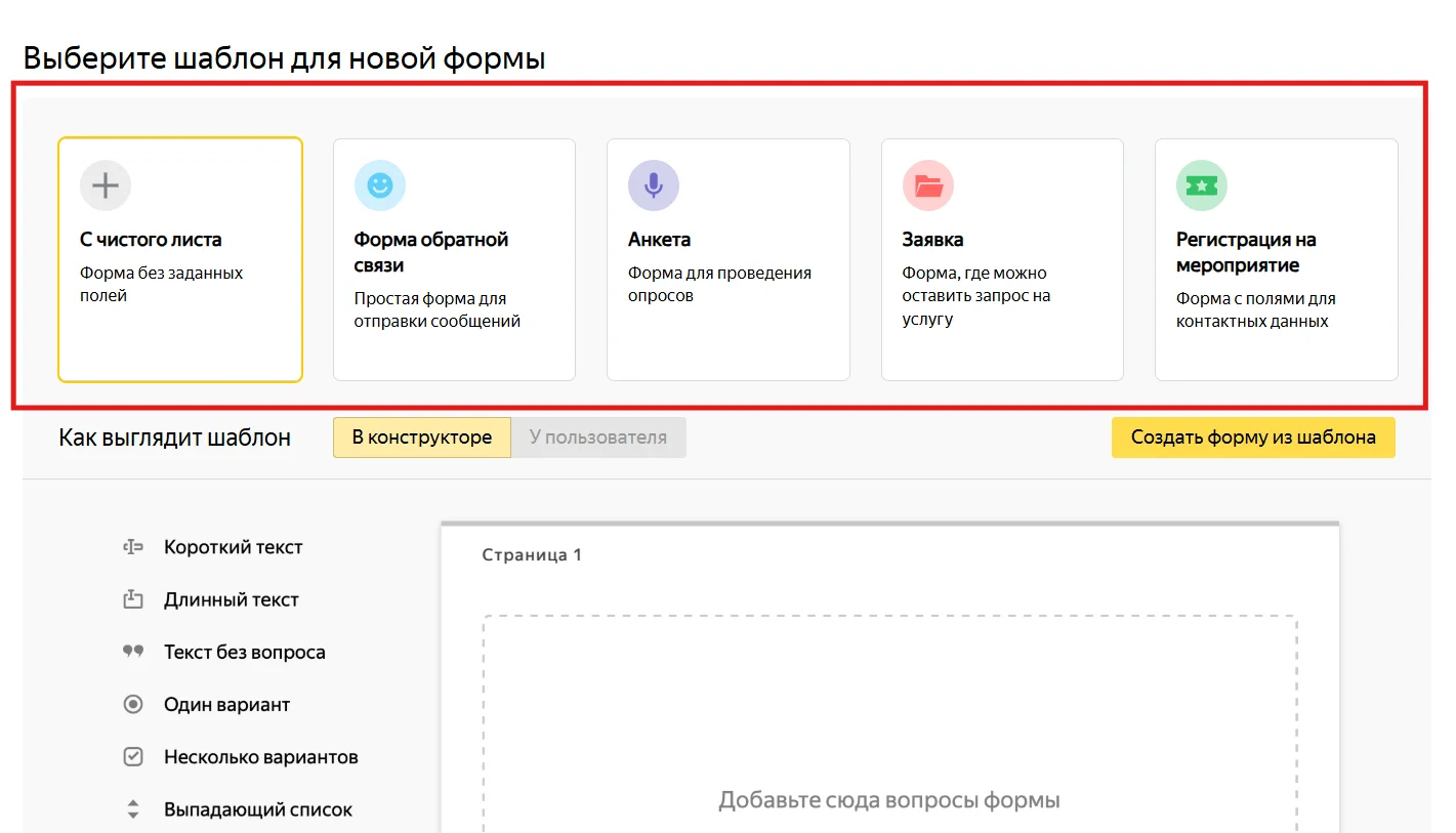Если вы решили создать опрос или анкету, откройте сервис Yandex Forms. Сначала нужно определиться с типом формы. Ресурс предлагает несколько шаблонов на выбор. Вы можете взять за основу любой из них или создать свой с нуля.