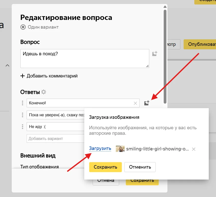 К ответам и к вопросу можно добавить картинку. Например, к ответу «Конечно!» добавить фото довольной девочки.