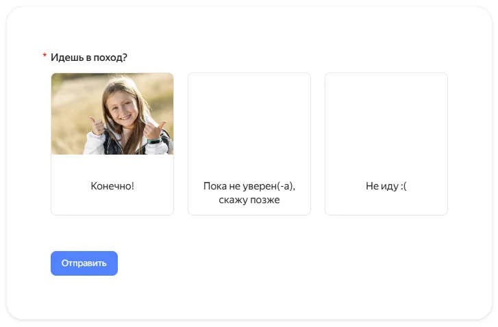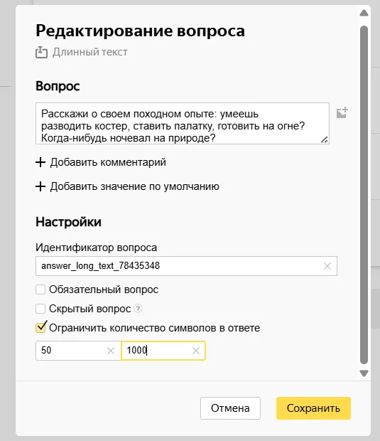 Длинный текст подойдет, если нужно узнать побольше информации. Например, спросить будущих участников похода, умеют ли они разводить костер и жить в палатке. Можно добавлять в таких вопросах уточняющие комментарии, чтобы отвечающий лучше понял вопрос и дал более развернутый ответ.