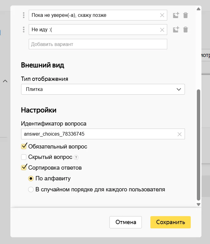 Также можно сделать вопрос скрытым — в этом случае система будет предлагать участникам ответы, которые предпочтительны. Также скрытым вопрос можно сделать, если вам нужно собрать статистику по ответам с помощью UTM-метки. Подробнее о скрытых вопросах можно узнать в этой статье.