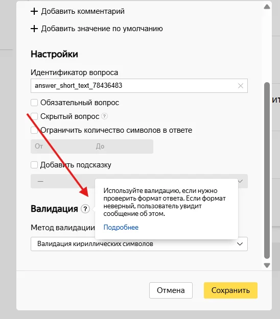 В некоторых блоках есть функция валидации. С ее помощью вы можете разрешить участникам опроса использовать особый формат ответа. Например, только целые числа или писать только кириллицей.