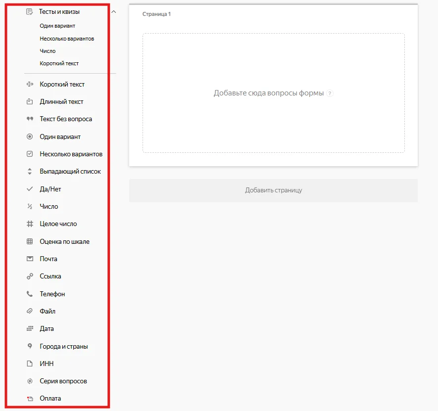Слева от формы расположены блоки с вопросами, которые можно добавлять в форму. Чтобы добавить в форму блок, перетащите его в поле формы или кликните по нему дважды. Блок добавится в форму, и вы сможете его отредактировать.