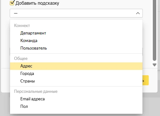 Иногда можно добавлять подсказки. Для этого выберите, какую именно подсказку получит пользователь. Например, система может подсказать указать адрес, пол или email-адрес.
