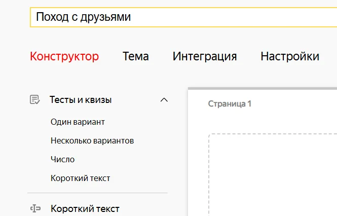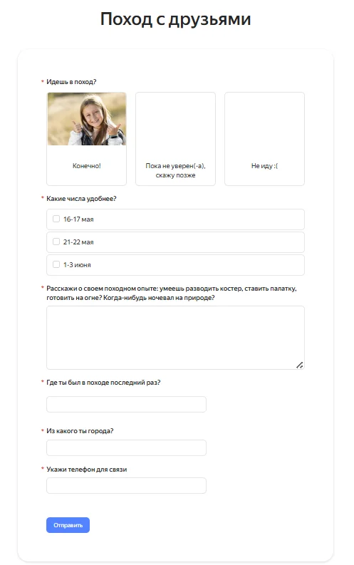 Предположим, вы собрались с друзьями в поход летом и хотите провести опрос, чтобы узнать мнения товарищей по поводу предстоящего мероприятия. Давайте сделаем форму с нуля.