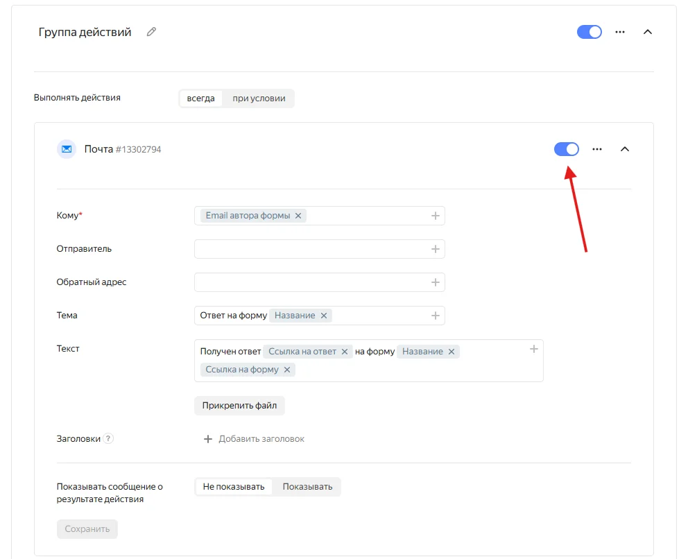 В первом поле нужно выбрать вопрос из списка, во втором — равно или не равно, и в третьем нужный ответ. Так система будет отправлять вам формы только с правильными ответами на тест или, наоборот, с неправильными — зависит от ваших потребностей.