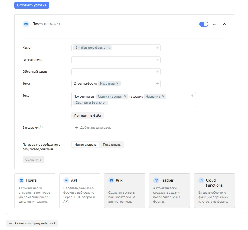 Блок «Wiki» настраивает отправку ответа на страницу Wiki. Блок «Tracker» позволяет создать задачу — она автоматически добавится в Tracker, когда пользователь заполнит форму. Блок «Cloud Functions» помогает собирать данные в одно хранилище.