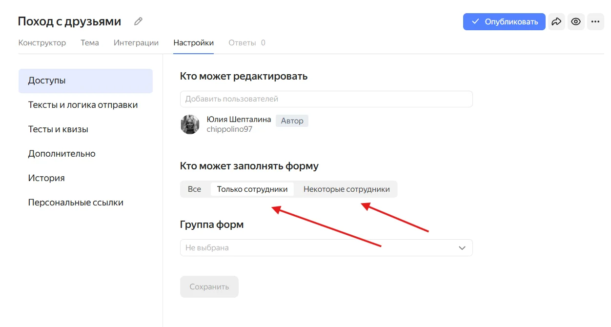 Для этого в подразделе «Доступы» укажите, что форму могут заполнять только сотрудники или некоторые сотрудники организации. В последнем случае добавьте почты сотрудников, которым нужно пройти опрос.