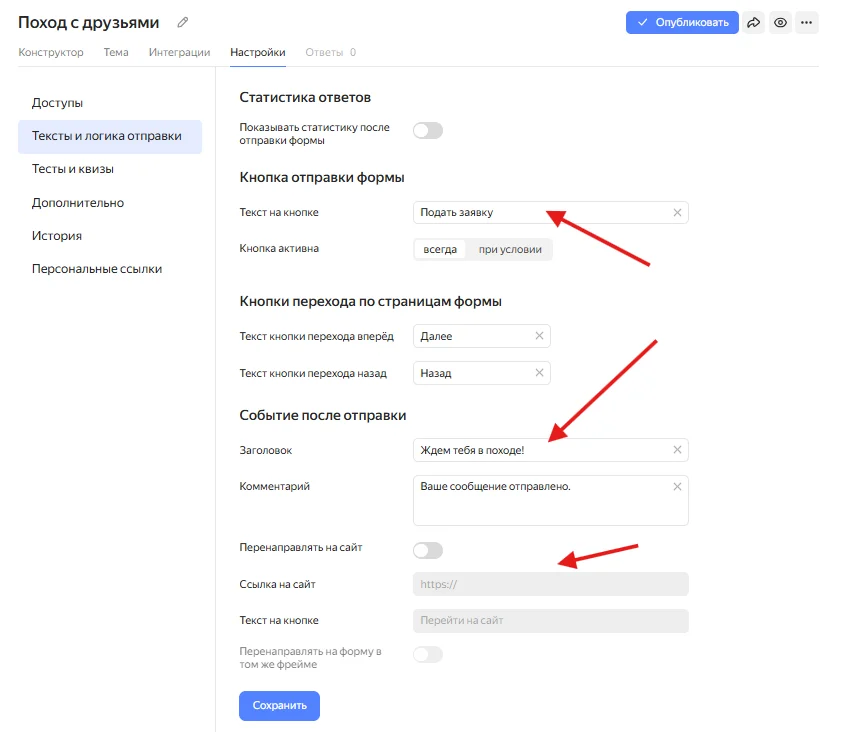 Далее выберите подраздел «Тексты и логика отправки». Здесь вы можете настроить кнопки и сообщение, которое пользователь увидит после отправки формы.