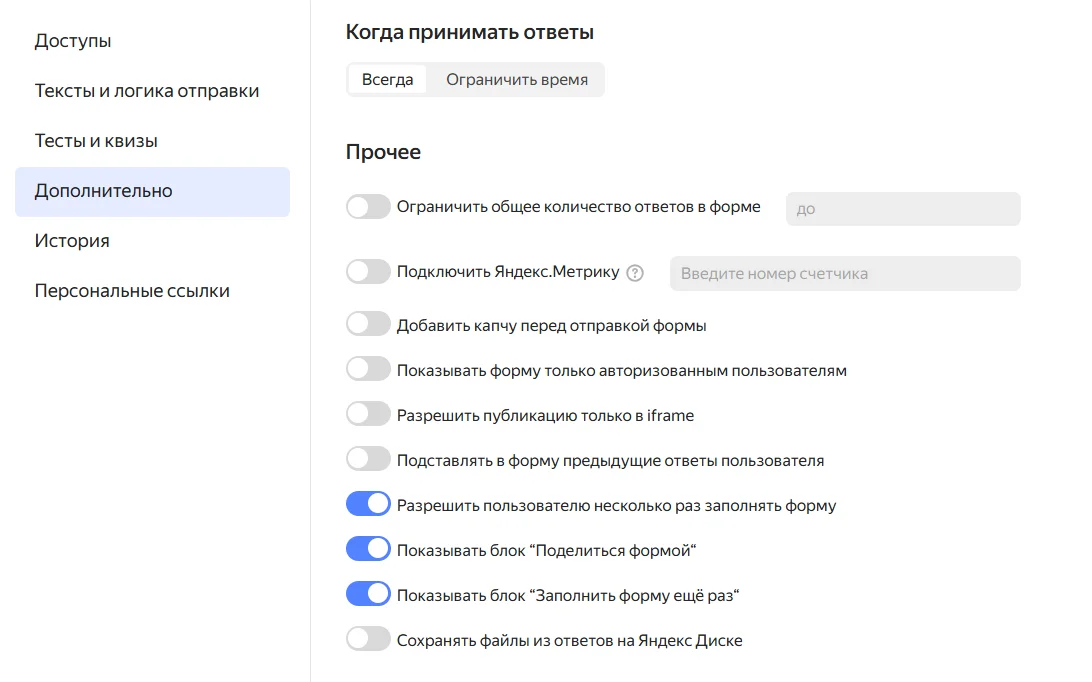 Зайдите в подраздел «Дополнительно». В нем можно выбрать разные параметры формы. Например, ограничить количество ответов или запретить участникам заполнять форму многократно.