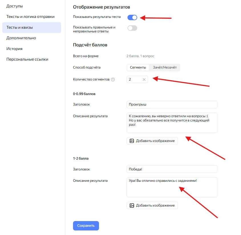 В блоке «Подсчёт баллов» есть два способа подсчета — по сегментам и «Зачёт/Незачёт». Сегмент — это просто диапазон баллов, определяющий уровень результата