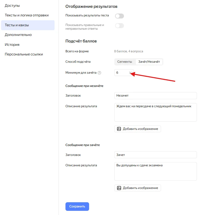 Например, в тесте можно набрать 8 баллов. Тогда минимумом для зачета можно поставить 6 баллов.