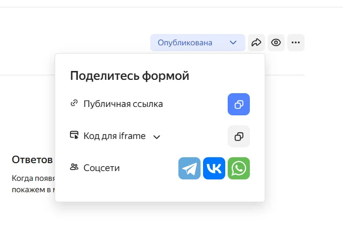 Сразу после публикации система предложит вам скопировать ссылку, поделиться формой в социальных сетях или скопировать код для iframe.