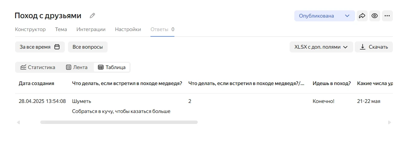 После рассылки формы вы в любой момент можете зайти в опубликованную форму для просмотра ответов. Результаты можно смотреть в трех форматах: статистика, лента или таблица — как вам удобнее.
