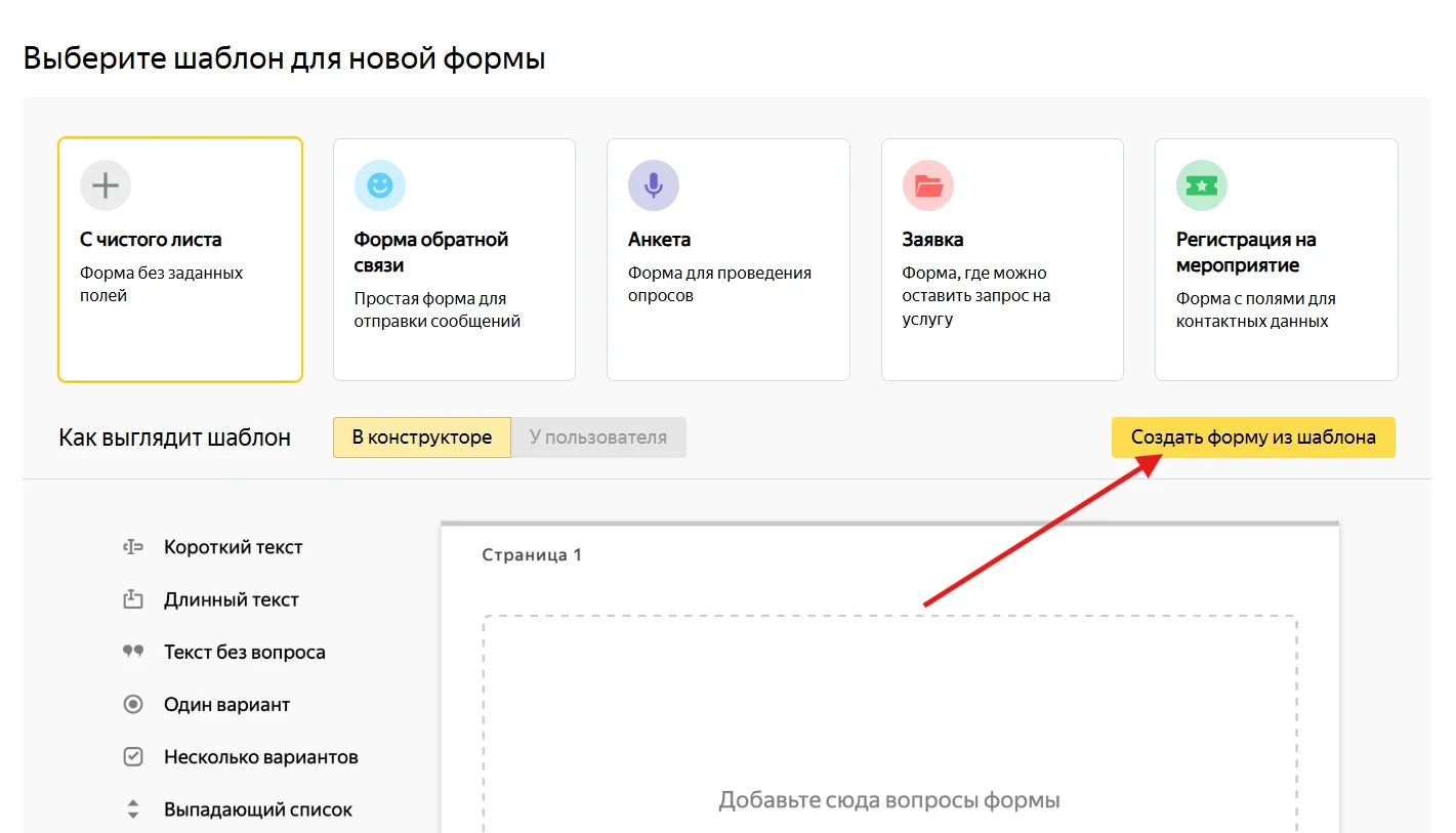Затем нажмите на кнопку «Создать форму из шаблона».