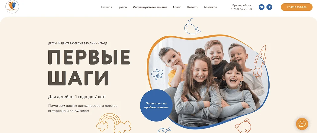 Используйте цвета по назначению. Золотое правило: спокойные цвета — для фона; броские — для акцентов. Не забывайте, что цвет задает настроение. Палитрой сайта можно вызвать нужные эмоции у посетителя. Например, цвета сайта детского центра развития «Первые шаги» передают атмосферу спокойствия и надежности — здесь не страшно оставить детей.