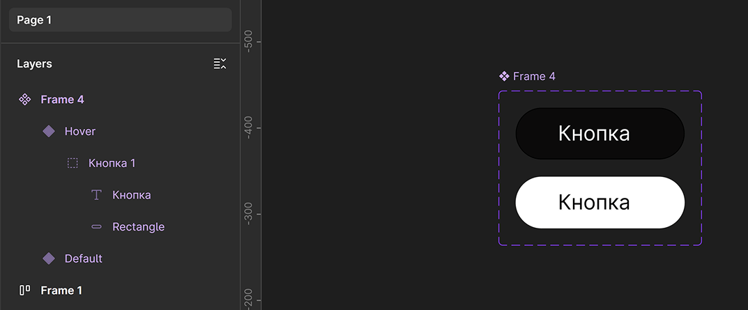 Создаем вариант, меняем ему цвет, называем его Hover. Исходный компонент по умолчанию называется Default. Когда мы создали вариант, вокруг двух кнопок образовалась общая рамка. Лучше оставить кнопки в ней, разработчику они пригодятся отдельно от макета. На макете можно использовать копии компонента Default.