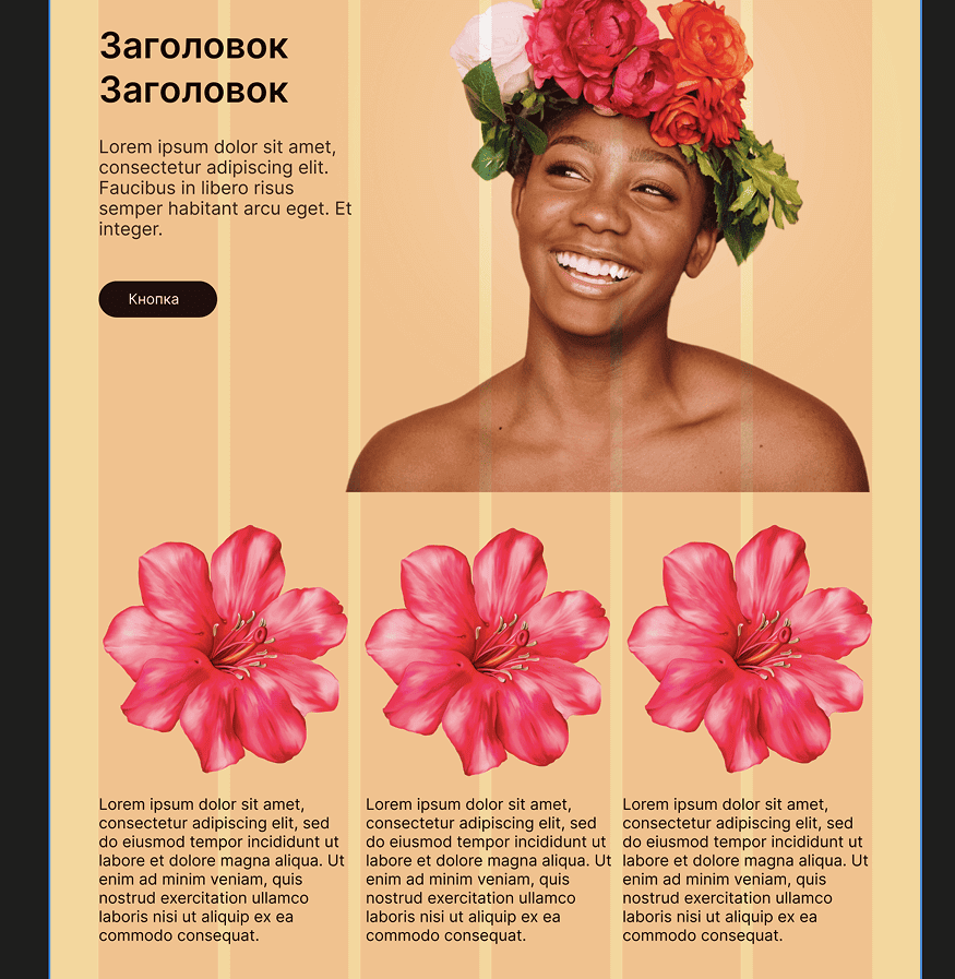 Чтобы сделать блок с тремя колонками, растягиваем страницу вниз, включаем сетку и ставим три иллюстрации и текст к ним равномерно по колонкам сетки.