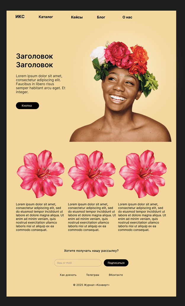 Начнем с подготовки: важно понять, для чего нужен сайт, кто ЦА, что ей важно знать. Представим, что мы провели предварительный анализ и решили, что компании нужен небольшой информационный сайт. Мы сделаем главную страницу. На ней будет основной блок с описанием предложения и CTA-элементом, блок с описанием преимуществ в трех колонках, меню для перехода на другие страницы и футер — «подвал сайта» с формой подписки на рассылку и контактной информацией.