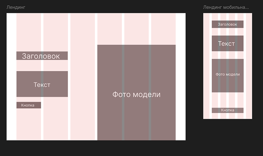 Полезно заранее определить, что и где будет на странице. На данном этапе мы лишь расставляем основные элементы на будущем лендинге: текст, иллюстрацию и кнопку. Все элементы пока показываем схематично: в виде серых прямоугольников, окружностей и крупного текста. Добавить элементы можно с помощью панели внизу.