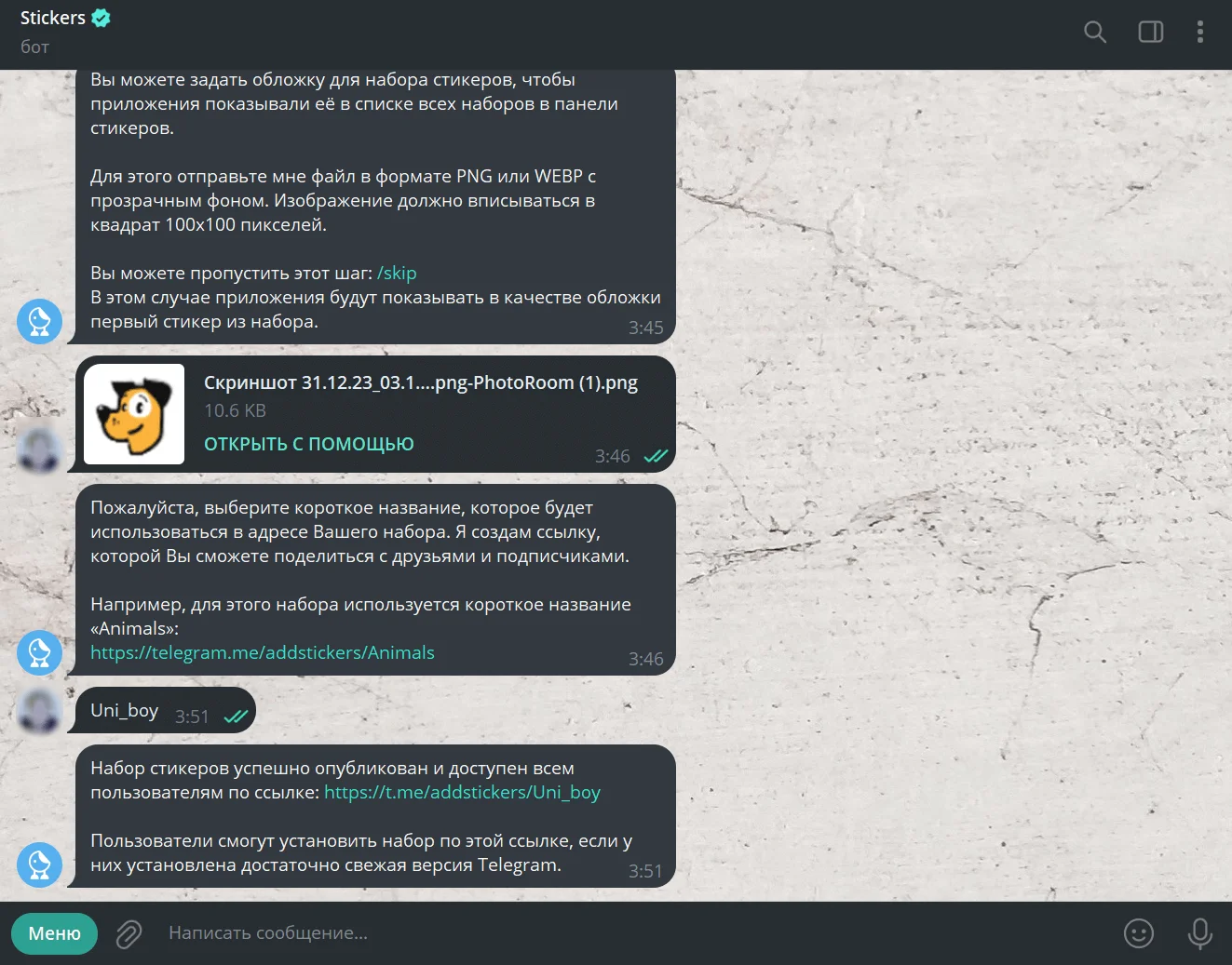 9. Пишем название набора. И вот бот сообщает, что стикерпак опубликован и находится по ссылке https://t.me/addstickers/Uni_boy, которой можно поделиться. Кликаем на эту ссылку, чтобы добавить набор себе.