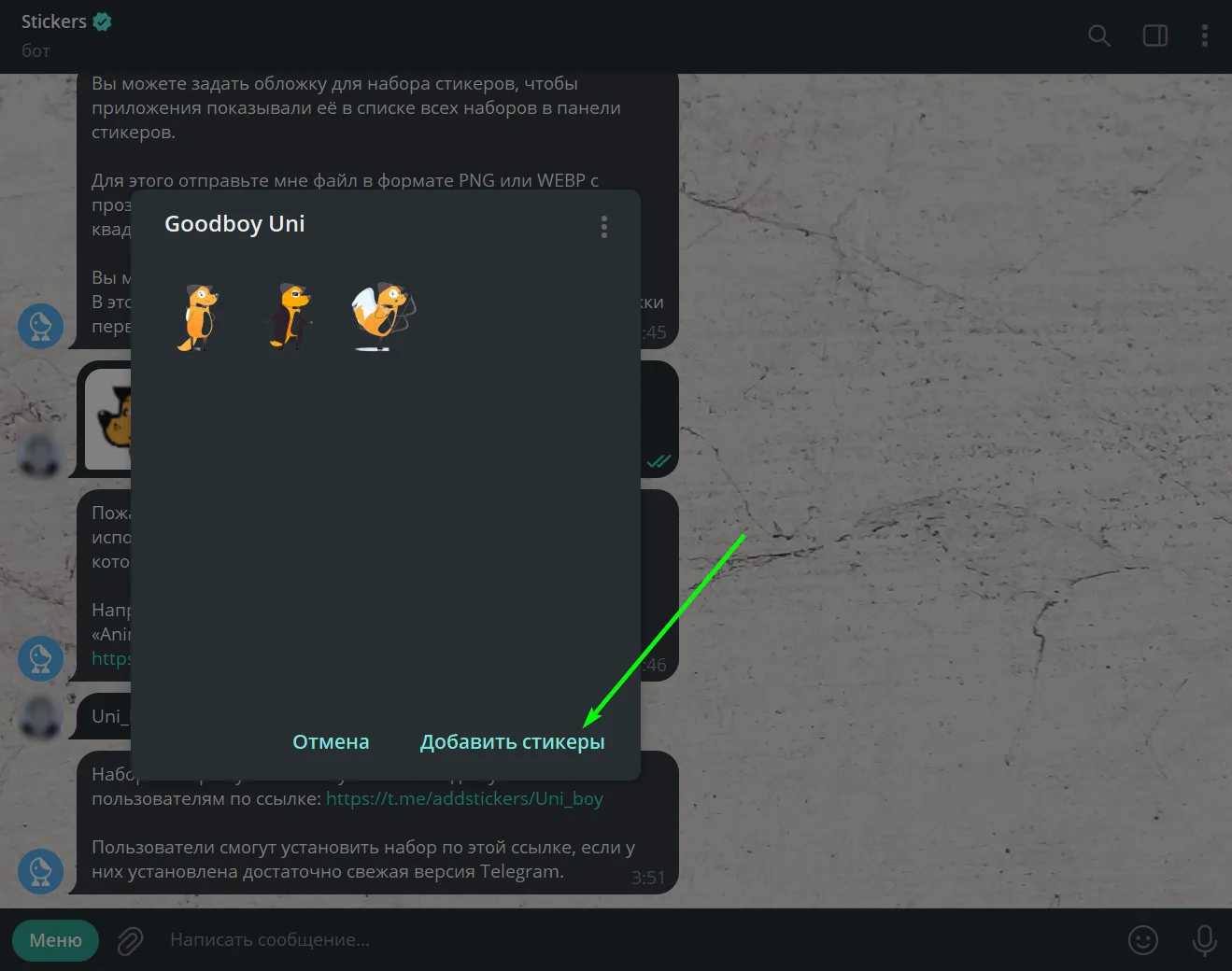 Пошаговое добавление стикерпака выглядит так: