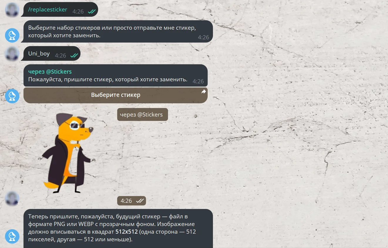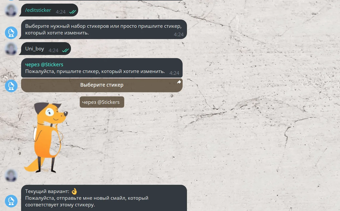 Готовый стикерпак можно в любое время отредактировать, изменить или дополнить. Для этого в меню бота предусмотрены специальные команды. Просто введите нужную команду, затем выберите нужный пакет из предложенных вариантов и следуйте подсказкам.