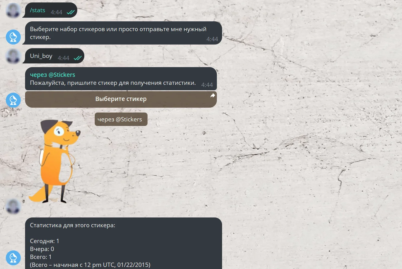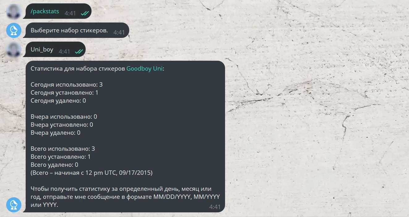 Количество использований отдельного стикера — /stats. Пришлите наклейку для проверки, а бот покажет количество отправок сегодня, вчера и всего. Здесь также можно смотреть данные за определённую дату.