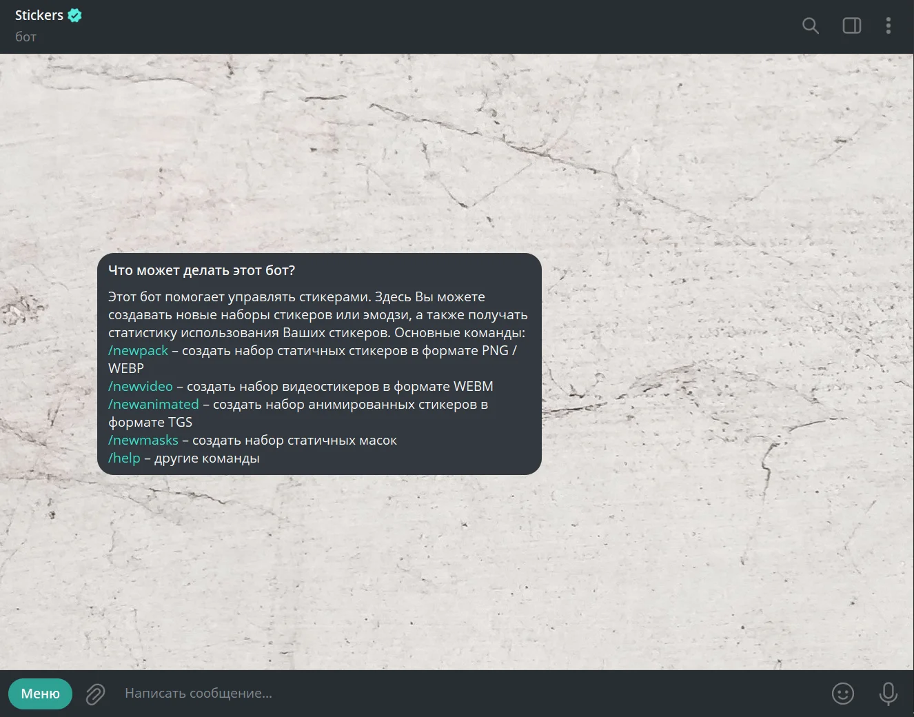 1. Перейдите в бот @Stickers. В приветственном сообщении вы увидите перечень доступных команд. В данном случае нам потребуется /newpack – создать набор статичных стикеров в формате PNG / WEBP. Кликните на команду для начала работы.