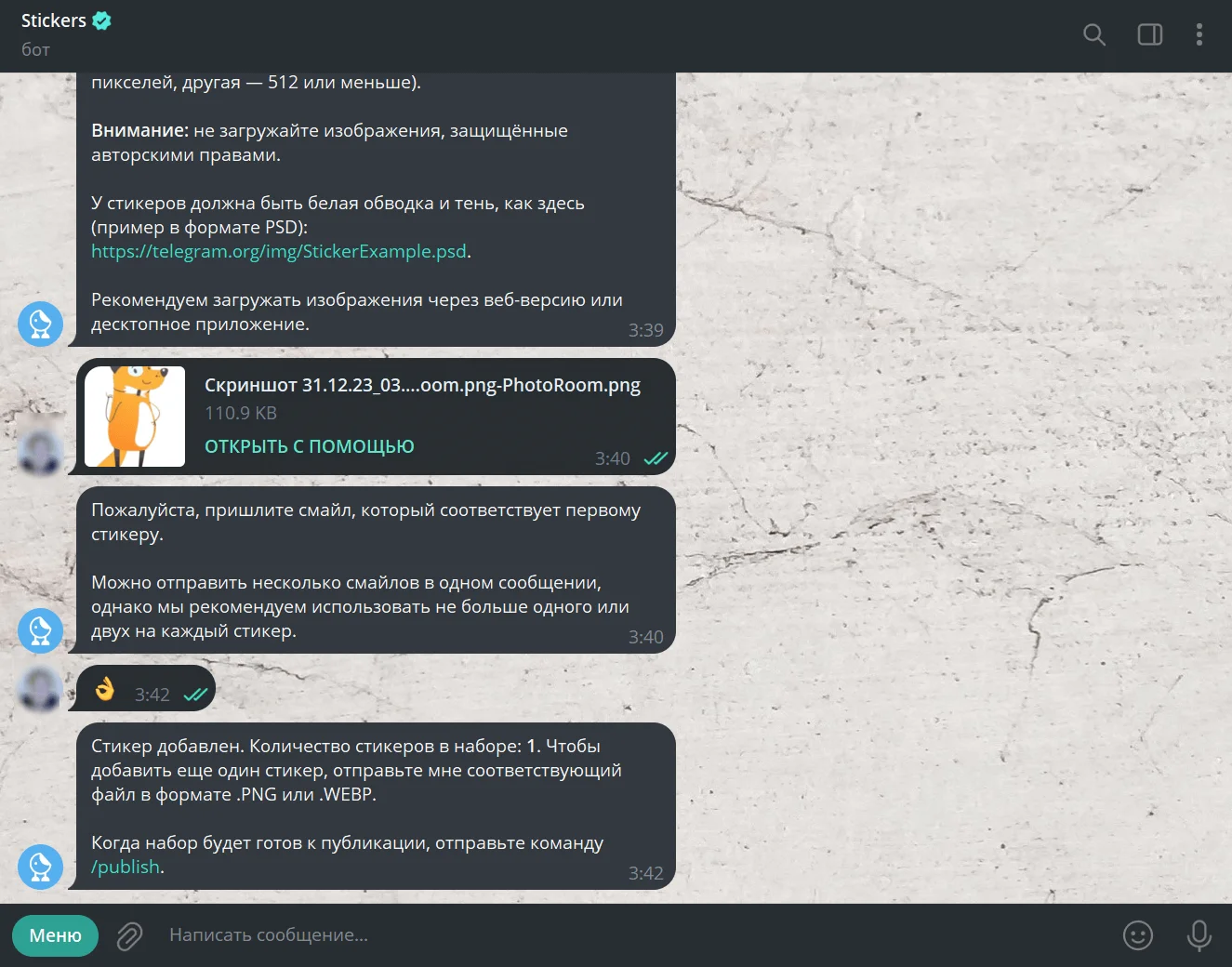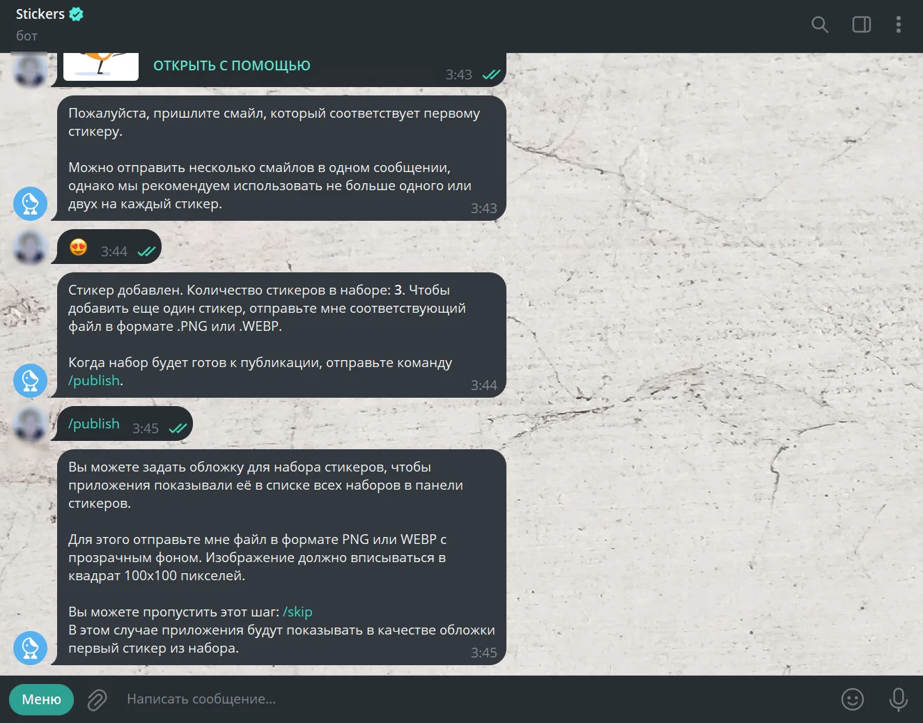 6. По аналогичному принципу добавим оставшиеся два стикера: отправляем картинку для наклейки, а следом смайл для автозамены. Когда все элементы добавлены, нужно отправить команду /publish — опубликовать. Просто кликните на команду.
