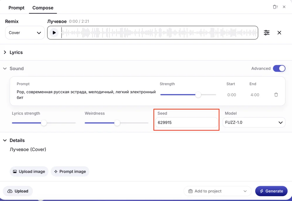 - Seed управляет случайностью генераций. Если не укажете seed, при каждом генерации трек будет отличаться даже с тем же промптом и настройками. Фиксируя seed, сможете воспроизвести точно тот же звук в будущем, сохранив все параметры.
