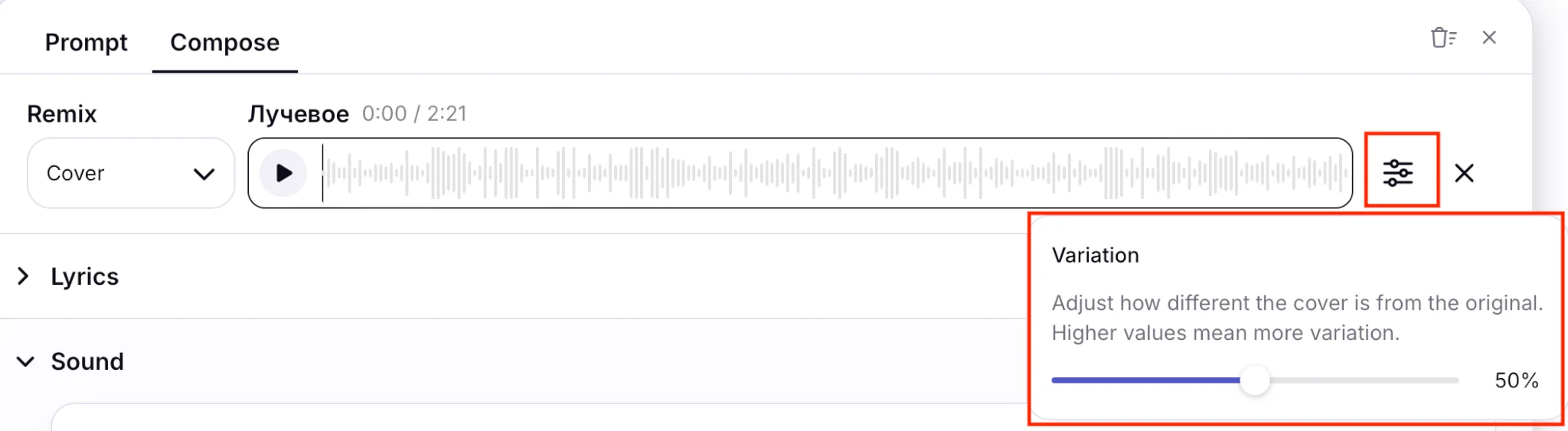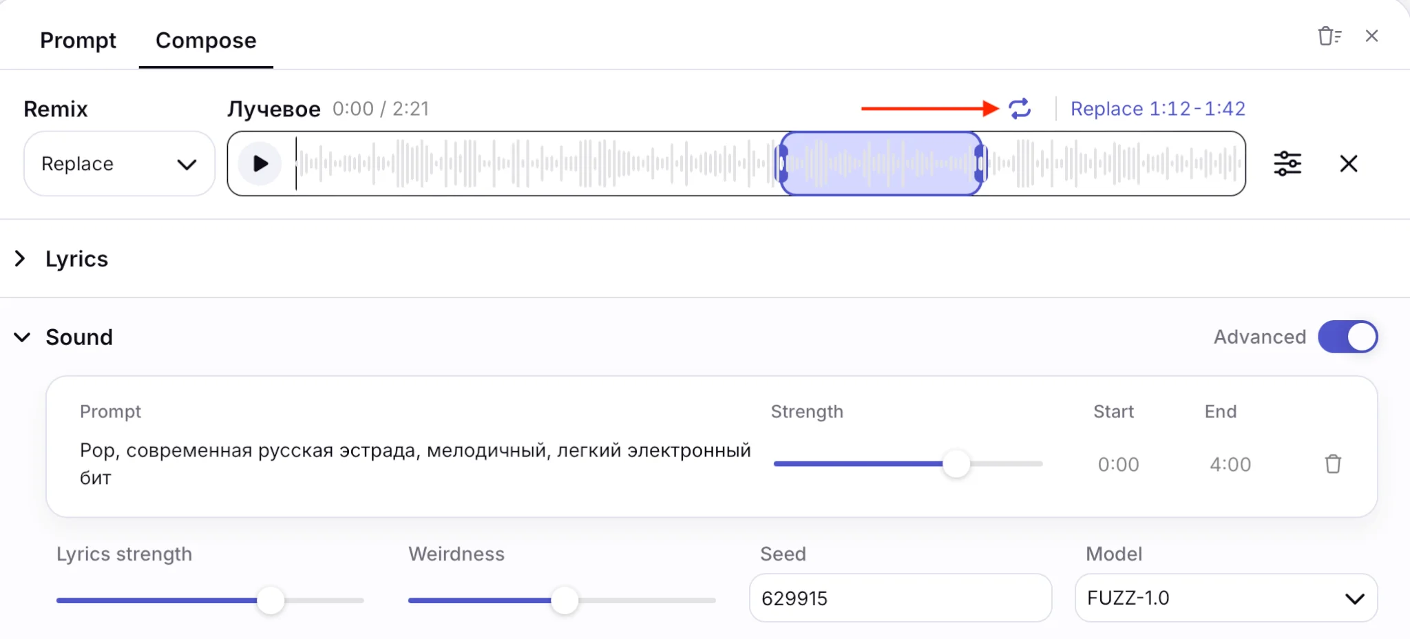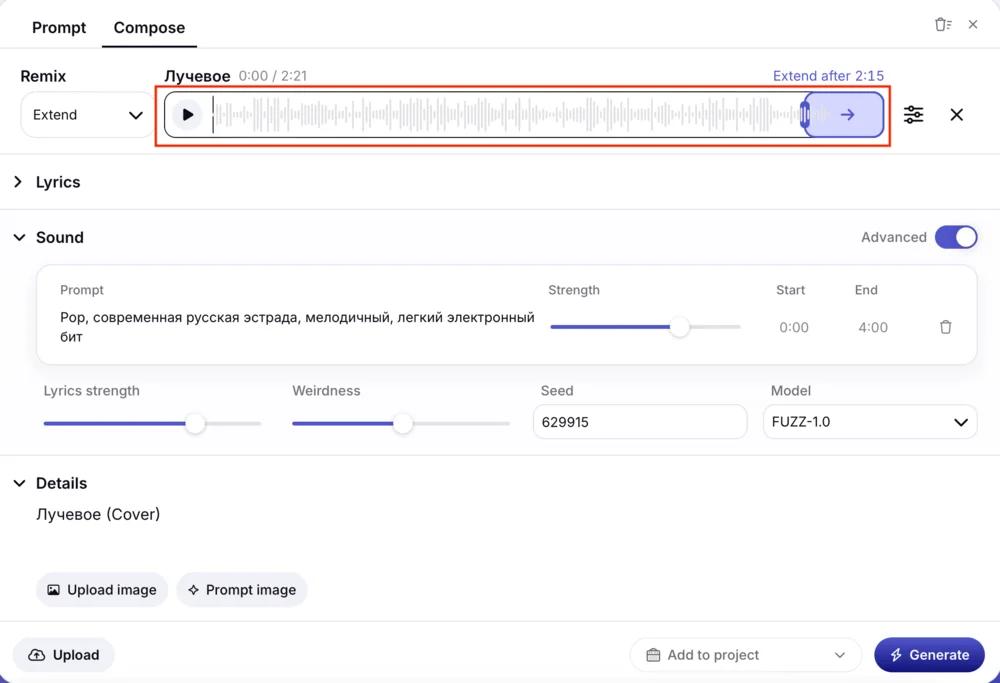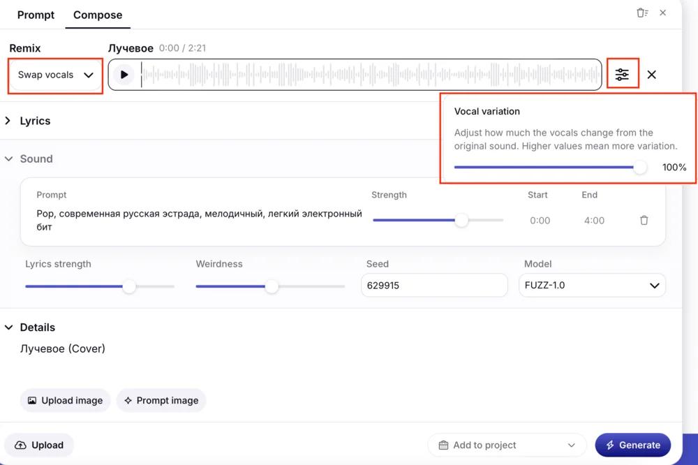 - Lyrics strength — указывает, насколько точно ИИ должен сохранять загруженный текст в песне. Чем он выше, тем точнее нейросеть сохраняет слова.