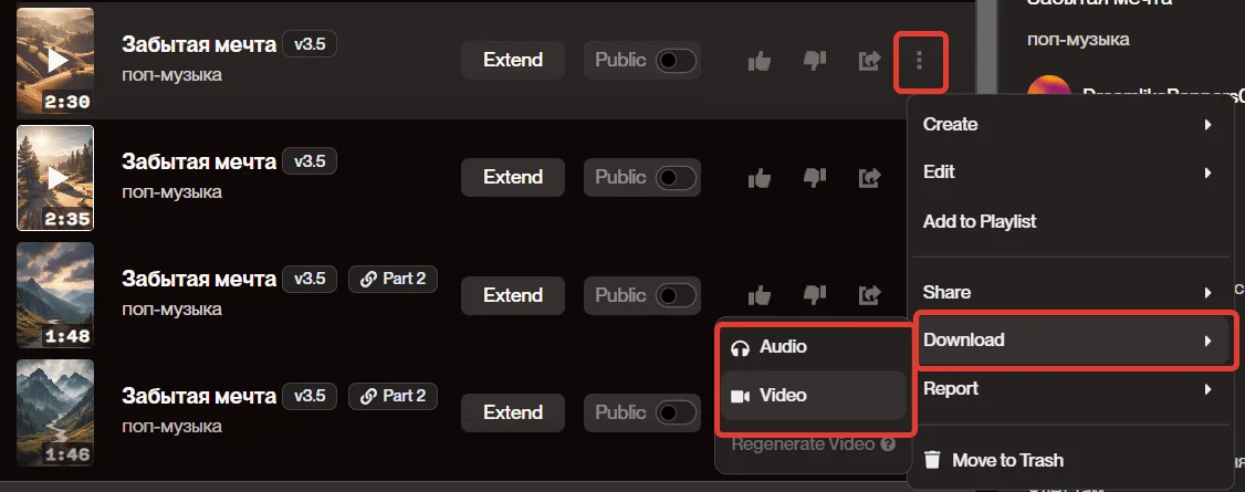 В Suno AI можно скачивать треки сразу после генерации. Для этого напротив нужной песни нажмите на три вертикальные точки, затем на Download и выберите Audio или Video. В первом случае вы скачаете только звуковую дорожку, во втором — вместе с обложкой.