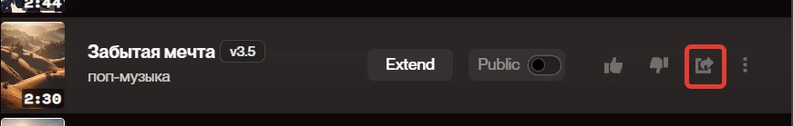 Чтобы поделиться ссылкой на песню в Suno AI, нажмите на значок со стрелочкой Copy Song Link. Ссылка скопируется в буфер обмена, и вы сможете поделиться ей в соцсетях, отправить знакомым в мессенджере.