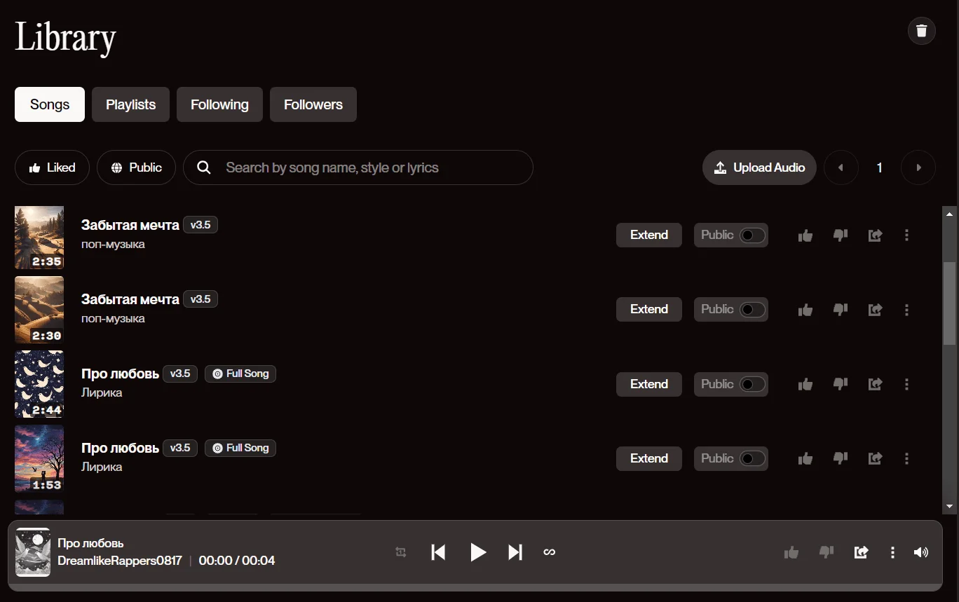 Если вы сгенерировали много песен и хотите быстро найти нужную, перейдите на страницу Library. Там удобно искать музыку по названию и жанрам.