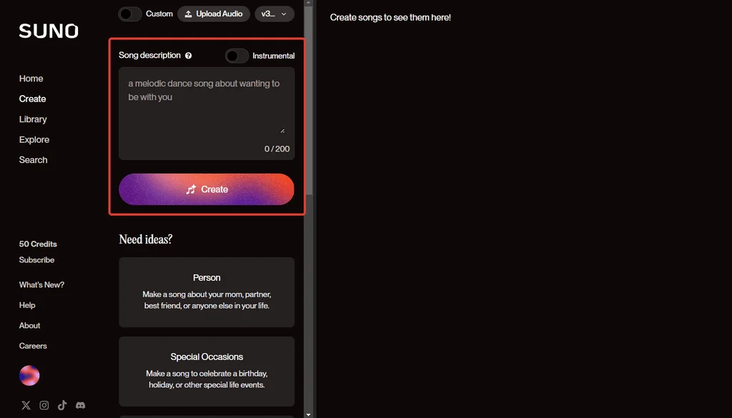 Над полем Song description есть переключатель Instrumental. Нажмите на него, если хотите получить трек без слов.
