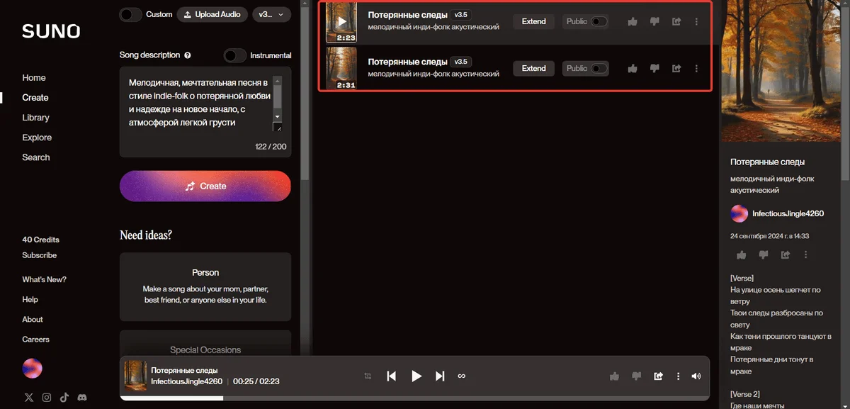 У них одинаковый текст, различается только вариант исполнения. Еще Suno AI сама придумала название песни — «Потерянные следы».