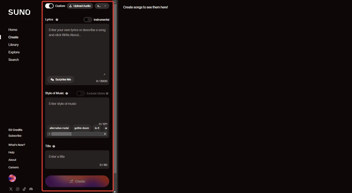 В продвинутом режиме можно создавать песни по своему тексту, рассмотрим, как это работает. На этой же странице Create включите режим Custom, переключатель находится над окном Song description. После этого появятся новые поля и параметры: