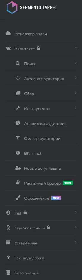 Segmento Target. Работает с тремя соцсетями — ВКонтакте, Одноклассниками, Instagram*. Основной функционал: