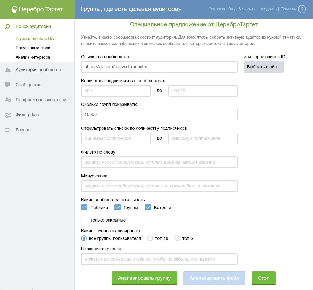 Церебро Таргет. Работает только с ВКонтакте. Среди особенностей: