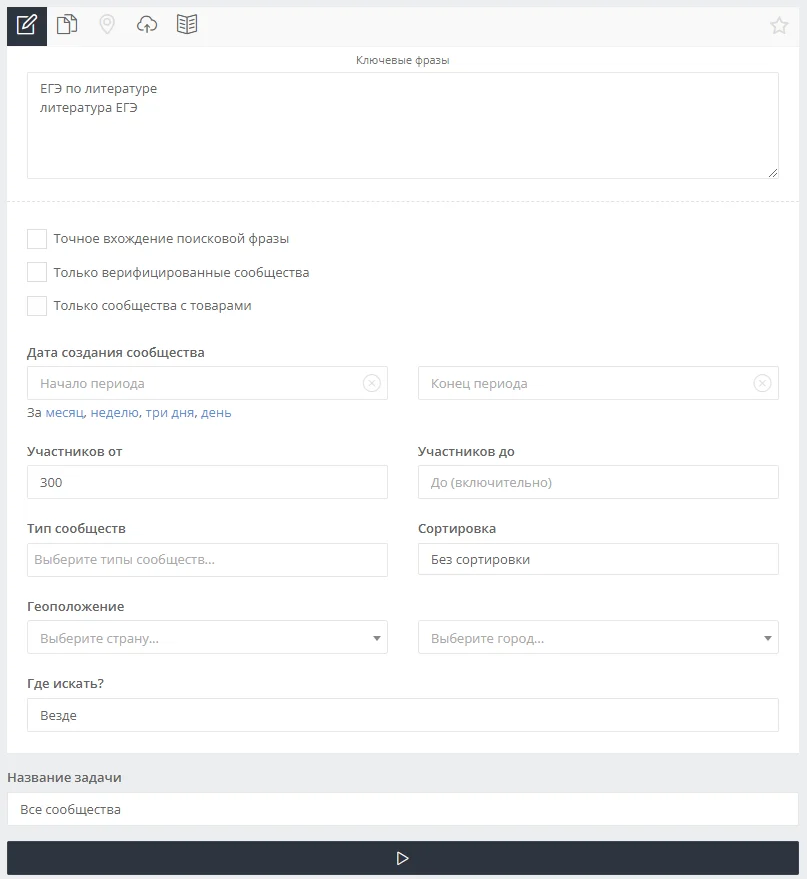 Также я указываю минимальное количество участников в группах — от 300. В группах поменьше вряд ли очень активная аудитория и много продаж. Тип сообществ и дата их создания мне не важны. Геоположение тоже не указываю, т.к. ЕГЭ сдают по всей России.