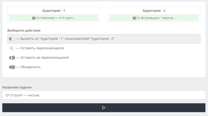 Чтобы аудитория в трёх базах не повторялась и бюджет не расходовался зря, базы нужно проверить на пересечение. Для этого перейдём во вкладку «Инструменты» → «Пересечение баз» → «Пользователи». Затем из каждой собранной базы нужно по очереди вычесть другие. Всего получится 6 операций.