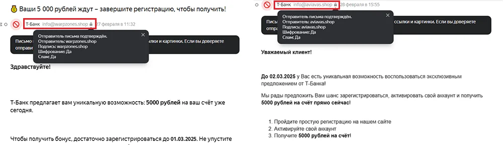 Получали когда-нибудь письмо якобы от крупной компании — но с подозрительным адресом и щедрым обещанием «бонуса за регистрацию»? Чаще всего такие рассылки сразу попадают в папку «Спам»: отправитель маскируется под известный бренд, но домен выглядит странно, а содержание больше похоже на мошенническую ловушку.