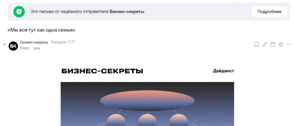 В Почте Mail.ru есть дополнительный инструмент для защищиты пользователей от мошенников, которые подделывают рассылки крупных брендов и отправляют фишинговые ссылки — верификация «надёжного отправителя». Верифицированные рассылки получают зелёный значок с галочкой на щите — он помещается на аватар отправителя, а также показывается в виде плашки при открытии письма.