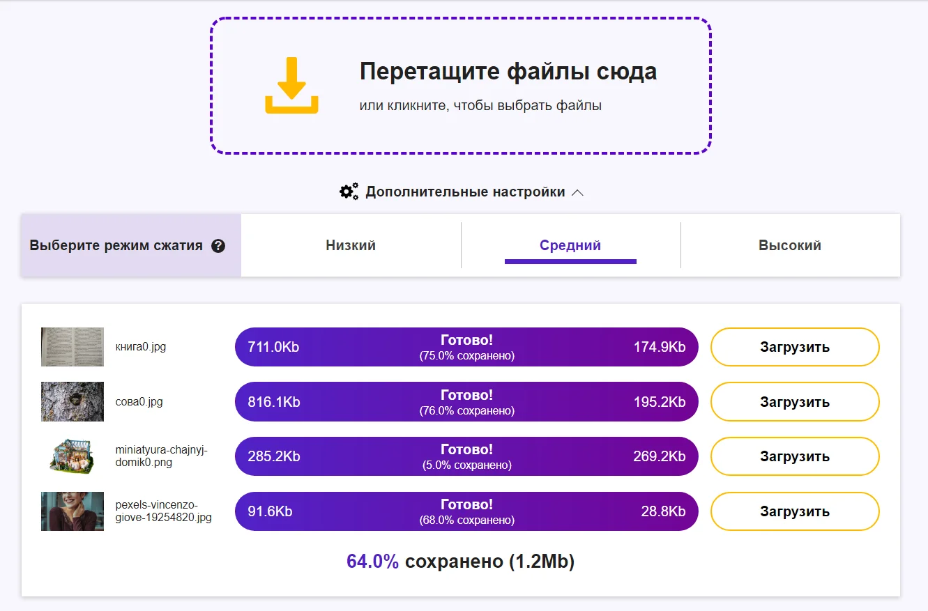 Websiteplanet менее гибкий в настройках — он предлагает на выбор три уровня сжатия: низкий, средний и высокий. Низкий — сохраняет качество, а высокий — максимально сжимает изображение.
