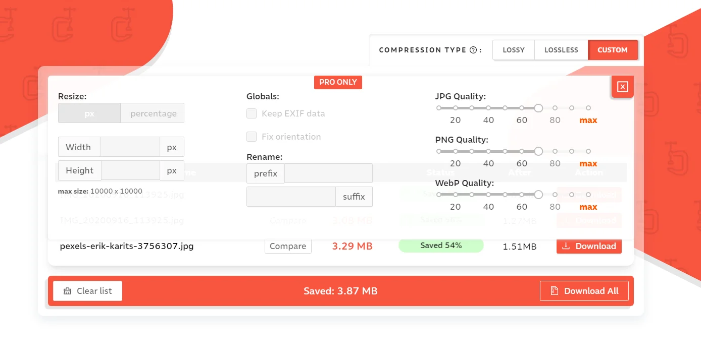 Платный тариф позволяет загружать сразу несколько картинок, выбирать один из двух уровней качества, настраивать размер фото. Кроме того, в Pro-версии можно оптимизировать по ссылке всё содержимое страницы целиком.