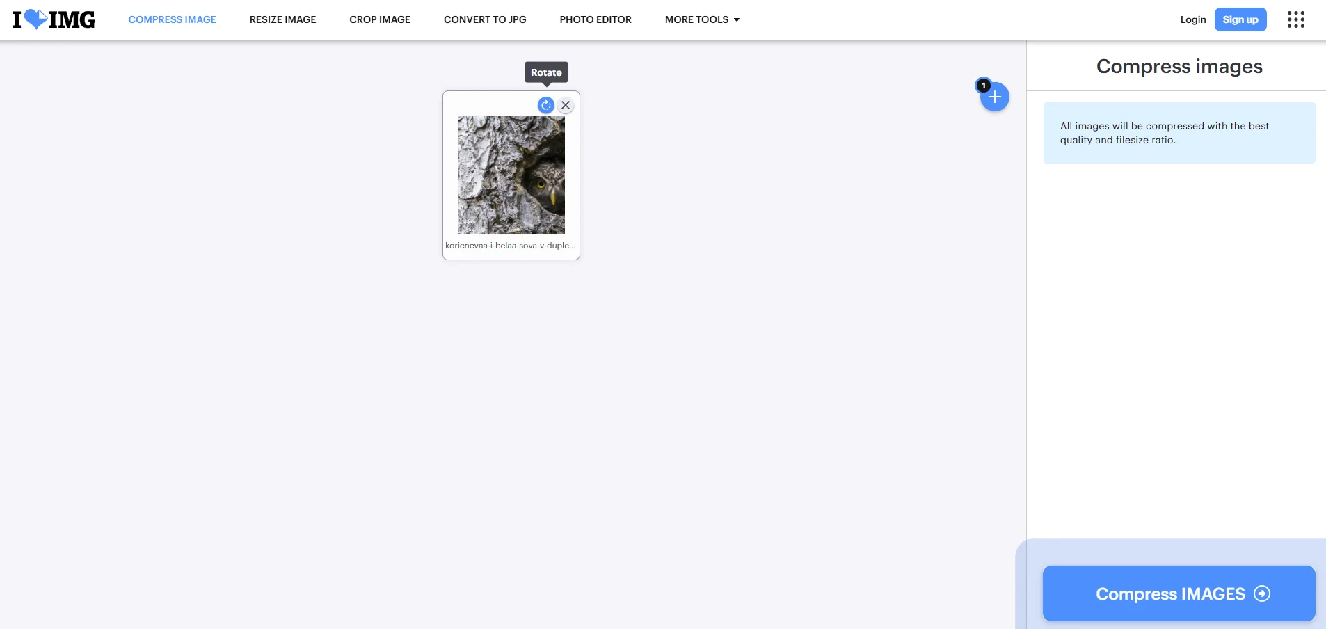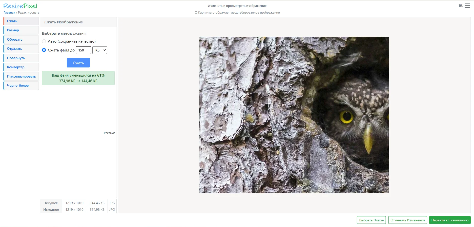 Интересное отличие сервиса в том, что здесь можно задать конкретный вес картинки. Например, мне нужны картинки для сайта до 150 КБ, чтобы они быстро грузились. В случае с картинкой совы сервис сжал изображение на 61%, при этом качество не сильно пострадало.