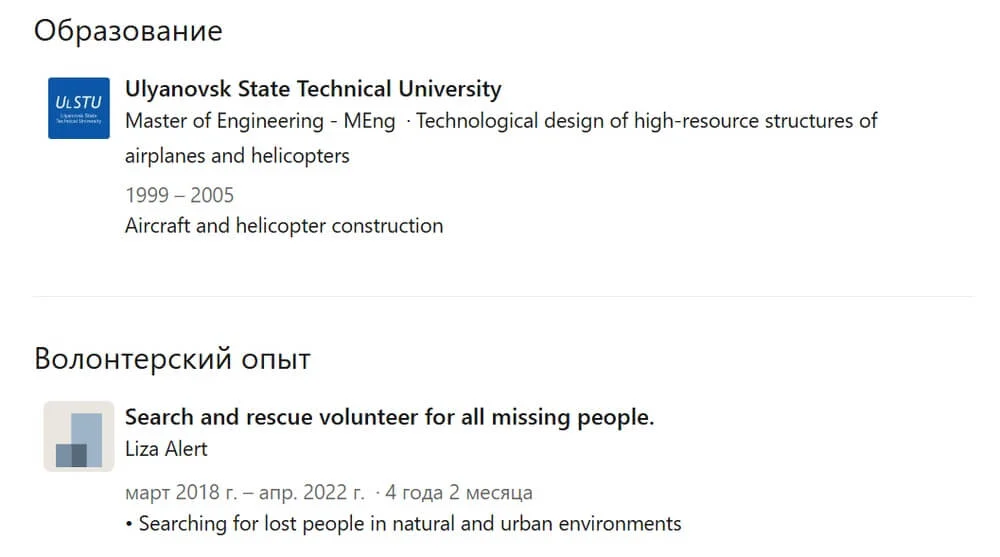 Нужно указать организации, в которых вы учились или проходили стажировку, курсы повышения квалификации, волонтёрские проекты и акции, в которых принимали участие. В целом эти активности можно заполнить лаконично, без лишних деталей.