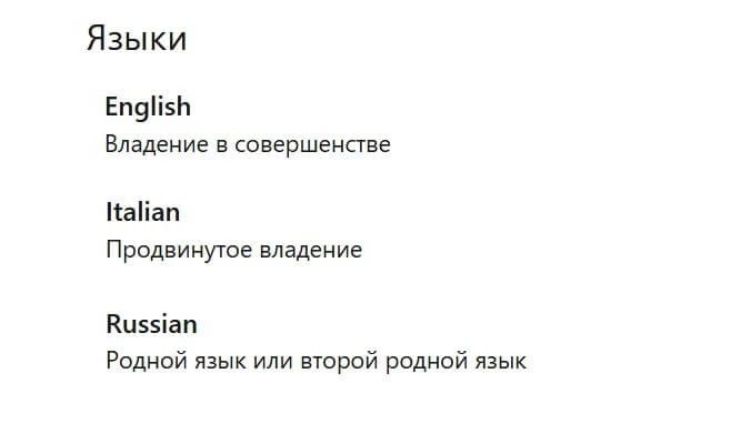 Стоит указать те, на которых потенциально можно работать — самостоятельно или с нейросетью. Например, вести деловую переписку, заполнять отчеты. Этот раздел скорее дополнительный, так как при отклике на вакансию нужно дополнительно указать владение языком. Поэтому на раздел в самом профиле обращают уже не так много внимания.