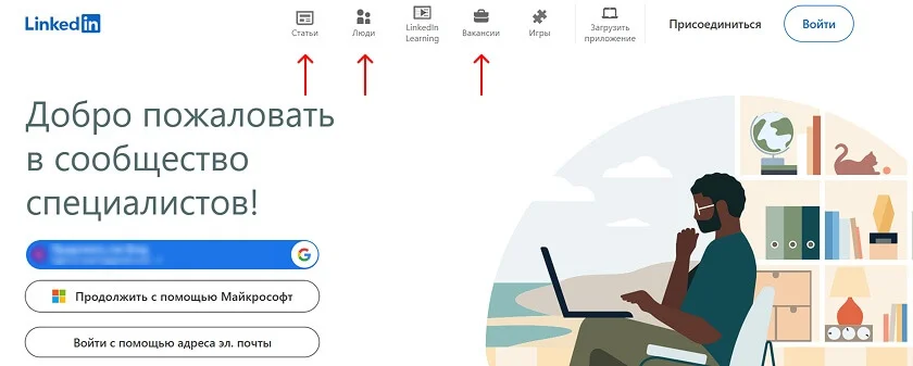 Вакансии в LinkedIn можно посмотреть и без регистрации. Но она нужна, чтобы создать свое резюме и взаимодействовать с другими пользователями. Пройти авторизацию можно через главную страницу сервиса. Есть и отдельная инструкция для регистрации страницы бизнеса.